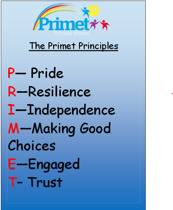 Welcome to Primet Primary School, where we provide an exciting school experience where children learn to 'be the best they can be'. We provide a rich and balanced curriculum where children flourish to build upon their talents and to progress in all areas both academically and holistically, based upon our core principles of: